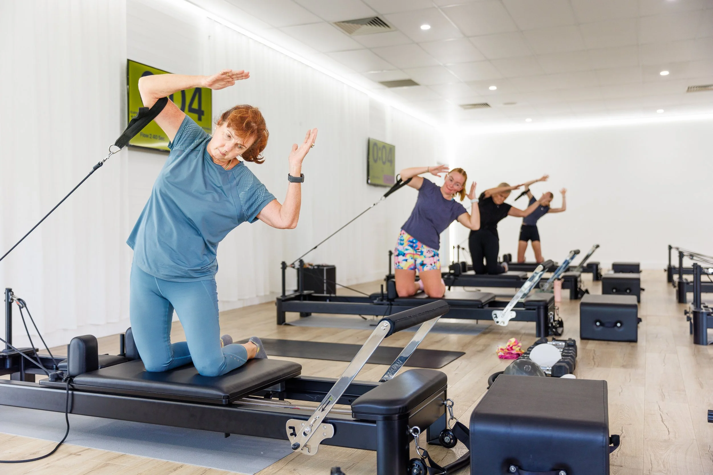 To give as many members of our local community as possible the chance to experience TruForm, we've doubled our usual class capacity to 24 for Open Day. Half the class kicks off on the reformers while the other half works on the mat — then we swap, so everyone gets the full experience.